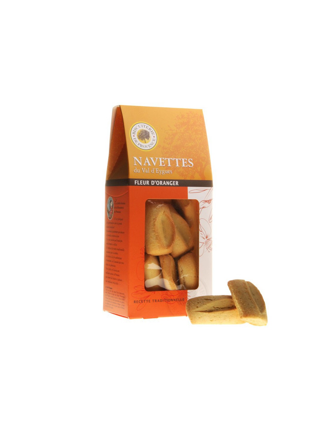 Farine de blé, sucre, beurre de baratte AOP Charentes-Poitou, œufs, eau de fleur d’oranger 5%, sel, arôme naturel d’oranger, poudre à lever naturelle (amidon de blé, bicarbonate de sodium, bi- tartrate de potassium).