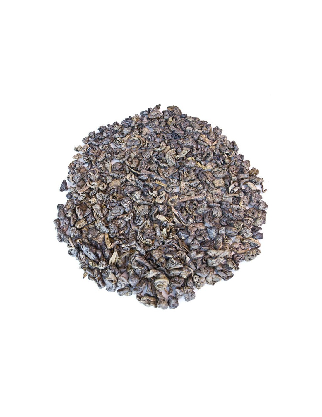 Thé non fermenté roulé en boules d'environ 2,5 millimètres, le gunpowder est traditionnellement utilisé pour le thé vert à la menthe.